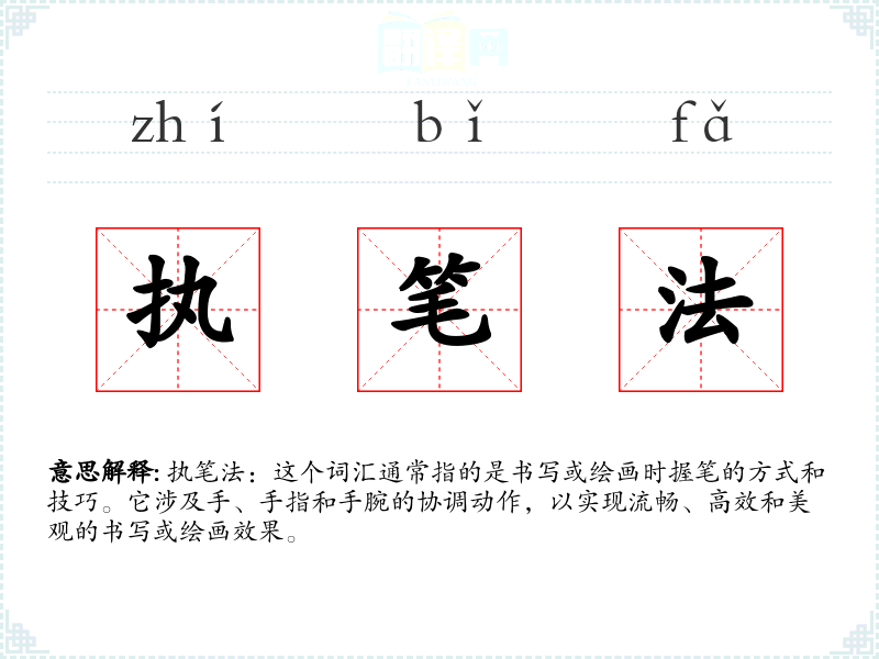执笔法:这个词汇通常指的是书写或绘画时握笔的方式和技巧。它涉及手、手指和手腕的协调动作,以实现流畅、高效和美观的书写或绘画效果。