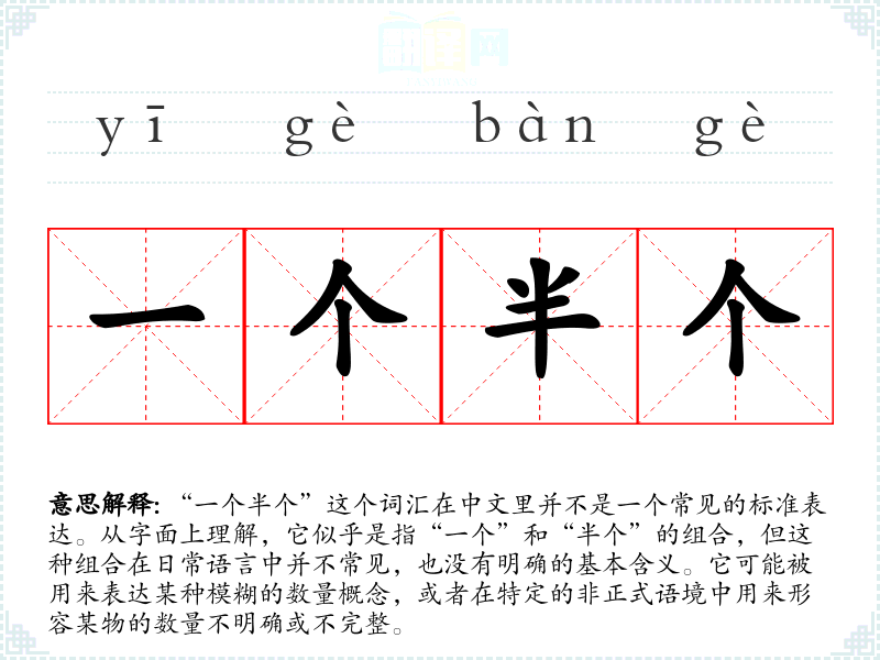 “一个半个”这个词汇在中文里并不是一个常见的标准表达。从字面上理解,它似乎是指“一个”和“半个”的组合,但这种组合在日常语言中并不常见,也没有明确的基本含义。它可能被用来表达某种模糊的数量概念,或者在特定的非正式语境中用来形容某物的数量不明确或不完整。