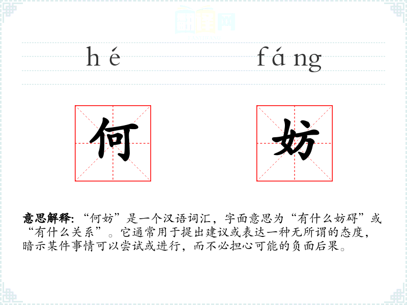 “何妨”是一个汉语词汇,字面意思为“有什么妨碍”或“有什么关系”。它通常用于提出建议或表达一种无所谓的态度,暗示某件事情可以尝试或进行,而不必担心可能的负面后果。
