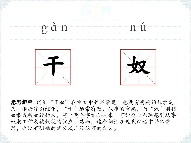 由于“干奴”不是一个标准词汇,我们无法提供一个确切的基本定义。它可能被某些人用来形容某种特定的劳动状态或社会角色,但这并不是一个普遍接受的用法。