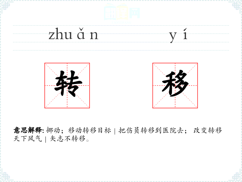 挪动;移动转移目标|把伤员转移到医院去; 改变转移天下风气|矢志不转移。