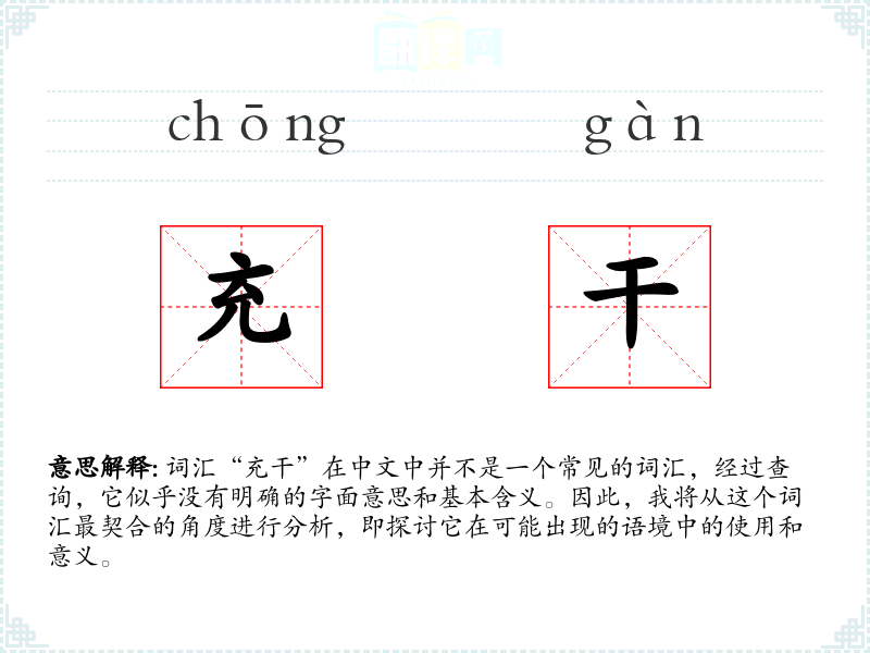如果“充干”是一个方言词汇,它可能在特定的地区或社群中有特定的含义。如果是行业术语,它可能与某个特定领域的工作或活动相关。如果是打字错误,它可能原本应该是“充分”、“充实”或其他类似的词汇。