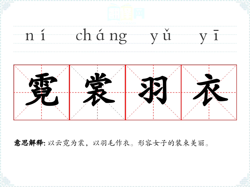 以云霓为裳,以羽毛作衣。形容女子的装束美丽。
