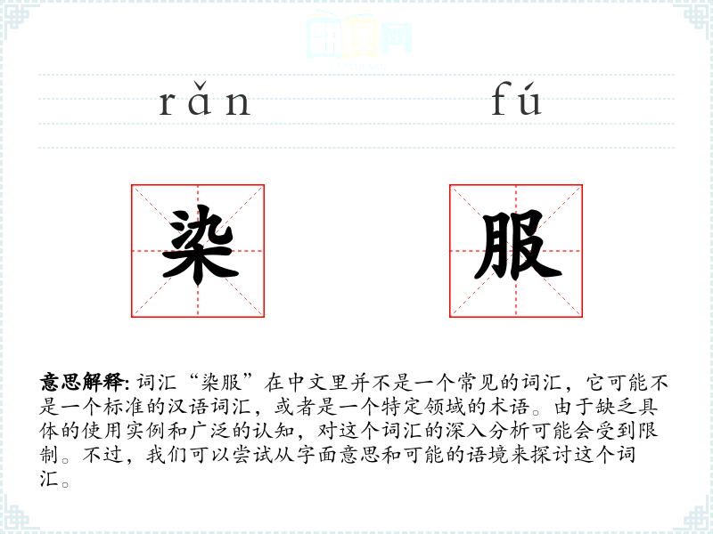 词汇“染服”在中文里并不是一个常见的词汇,它可能不是一个标准的汉语词汇,或者是一个特定领域的术语。由于缺乏具体的使用实例和广泛的认知,对这个词汇的深入分析可能会受到限制。不过,我们可以尝试从字面意思和可能的语境来探讨这个词汇。
