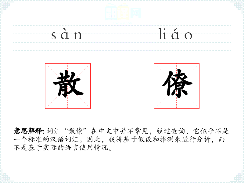 词汇“散僚”在中文中并不常见,经过查询,它似乎不是一个标准的汉语词汇。因此,我将基于假设和推测来进行分析,而不是基于实际的语言使用情况。