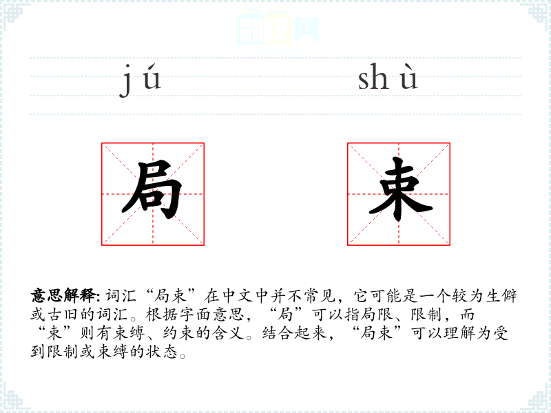 词汇“局束”在中文中并不常见,它可能是一个较为生僻或古旧的词汇。根据字面意思,“局”可以指局限、限制,而“束”则有束缚、约束的含义。结合起来,“局束”可以理解为受到限制或束缚的状态。