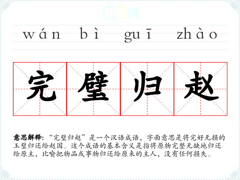 在英语中,类似的表达可能是“return something in its original condition”,但“完璧归赵”更具有文化和历史的深度。