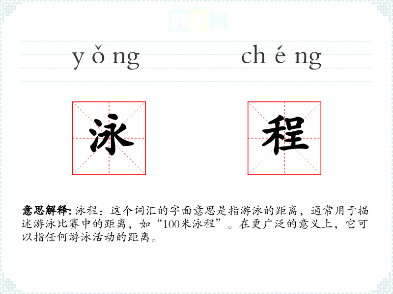 泳程:这个词汇的字面意思是指游泳的距离,通常用于描述游泳比赛中的距离,如“100米泳程”。在更广泛的意义上,它可以指任何游泳活动的距离。