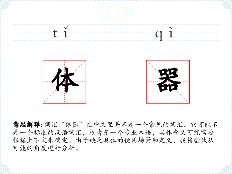 词汇“体器”在中文里并不是一个常见的词汇,它可能不是一个标准的汉语词汇,或者是一个专业术语,具体含义可能需要根据上下文来确定。由于缺乏具体的使用场景和定义,我将尝试从可能的角度进行分析。