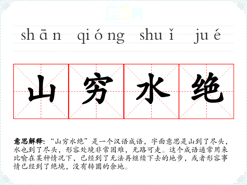 “山穷水绝”是一个汉语成语,字面意思是山到了尽头,水也到了尽头,形容处境非常困难,无路可走。这个成语通常用来比喻在某种情况下,已经到了无法再继续下去的地步,或者形容事情已经到了绝境,没有转圜的余地。