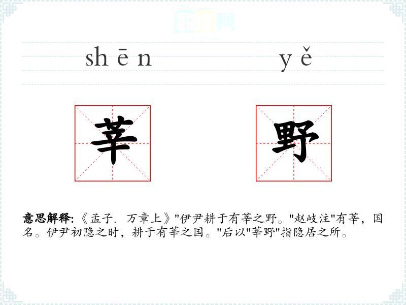 《孟子.万章上》"伊尹耕于有莘之野。"赵岐注"有莘,国名。伊尹初隐之时,耕于有莘之国。"后以"莘野"指隐居之所。