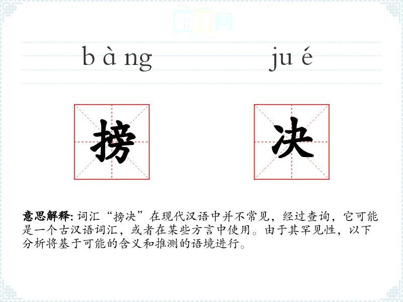 词汇“搒决”在现代汉语中并不常见,经过查询,它可能是一个古汉语词汇,或者在某些方言中使用。由于其罕见性,以下分析将基于可能的含义和推测的语境进行。
