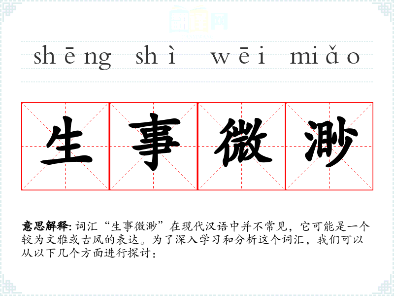 词汇“生事微渺”在现代汉语中并不常见,它可能是一个较为文雅或古风的表达。为了深入学习和分析这个词汇,我们可以从以下几个方面进行探讨: