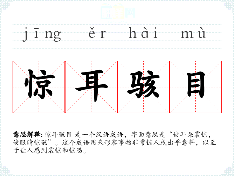 惊耳骇目 是一个汉语成语,字面意思是“使耳朵震惊,使眼睛惊骇”。这个成语用来形容事物非常惊人或出乎意料,以至于让人感到震惊和惊恐。