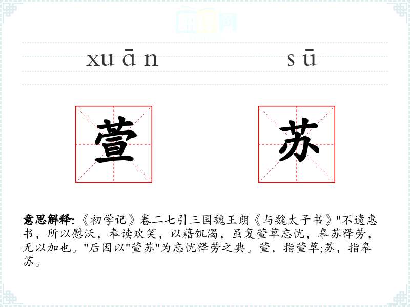 ,皋苏释劳,无以加也。"后因以"萱苏"为忘忧释劳之典。萱,指萱草;苏,指皋苏。