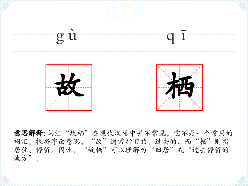 - 词源:“故”和“栖”都是古代汉语词汇,组合在一起形成了一个复合词。