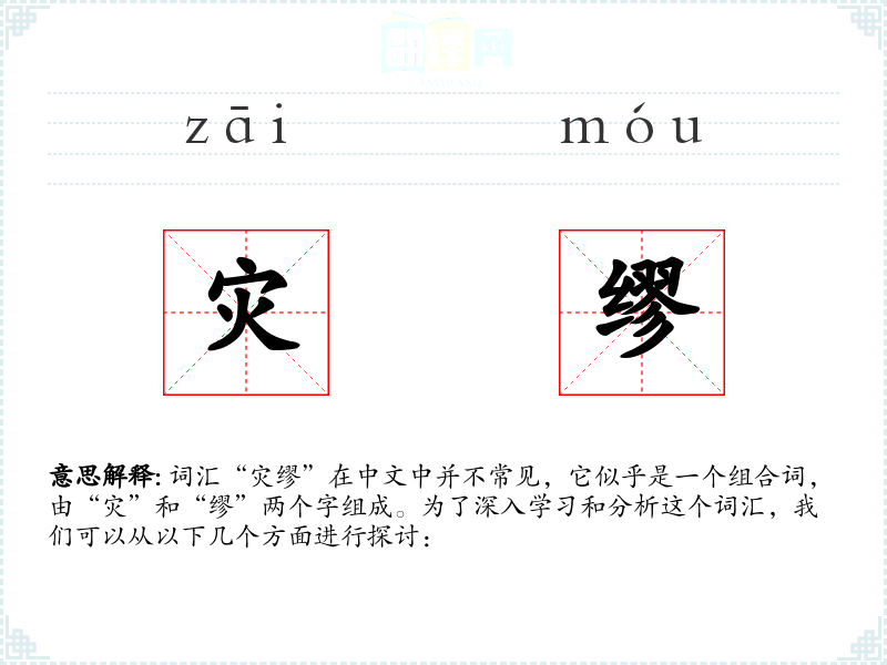 词汇“灾缪”在中文中并不常见,它似乎是一个组合词,由“灾”和“缪”两个字组成。为了深入学*和分析这个词汇,我们可以从以下几个方面进行探讨: