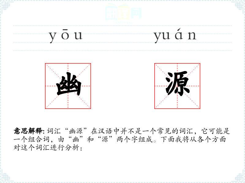 词汇“幽源”在汉语中并不是一个常见的词汇,它可能是一个组合词,由“幽”和“源”两个字组成。下面我将从各个方面对这个词汇进行分析: