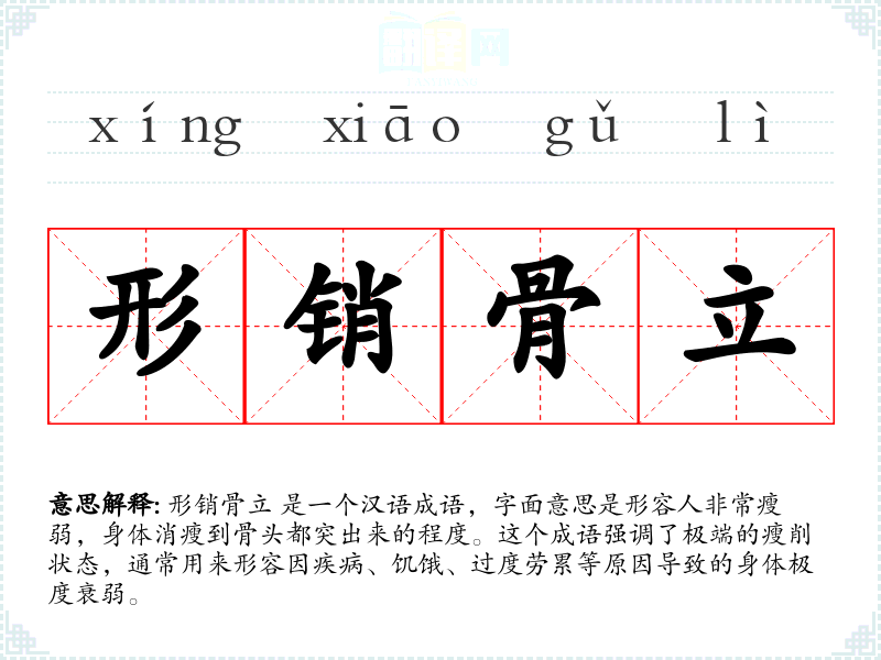 形销骨立 是一个汉语成语,字面意思是形容人非常瘦弱,身体消瘦到骨头都突出来的程度。这个成语强调了极端的瘦削状态,通常用来形容因疾病、饥饿、过度劳累等原因导致的身体极度衰弱。