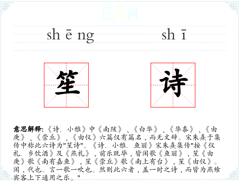 1.《诗.小雅》中《南陔》﹑《白华》﹑《华黍》﹑《由庚》﹑《崇丘》﹑《由仪》六篇仅有篇名﹐而无文辞。宋朱熹于集传中称此六诗为"笙诗"。《诗.小雅.鱼丽》宋朱熹集传"按《仪礼.乡饮酒》及《燕礼》﹐前乐既毕﹐皆闲歌《鱼丽》﹐笙《由庚》歌《南有嘉鱼》﹐笙《崇丘》歌《南上有台》﹐笙《由仪》。闲﹐代也。言一歌一吹也。然则此六者﹐盖一时之诗﹐而皆为燕飨宾客上下通用之乐。"