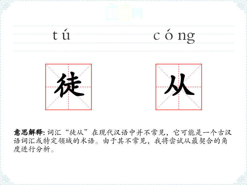 词汇“徒从”在现代汉语中并不常见,它可能是一个古汉语词汇或特定领域的术语。由于其不常见,我将尝试从最契合的角度进行分析。