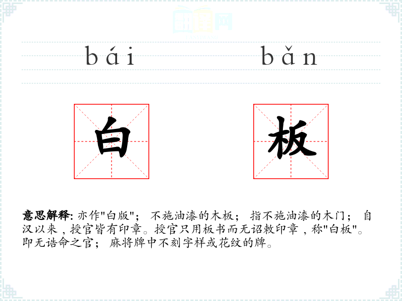 亦作"白版"; 不施油漆的木板; 指不施油漆的木门; 自汉以来﹐授官皆有印章。授官只用板书而无诏敕印章﹐称"白板"。即无诰命之官; 麻将牌中不刻字样或花纹的牌。