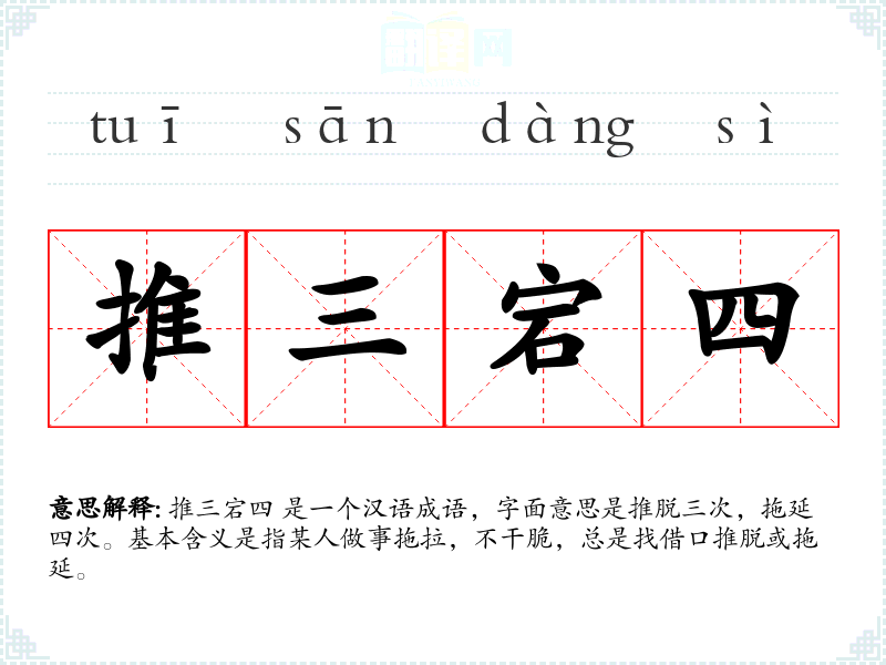 推三宕四 是一个汉语成语,字面意思是推脱三次,拖延四次。基本含义是指某人做事拖拉,不干脆,总是找借口推脱或拖延。