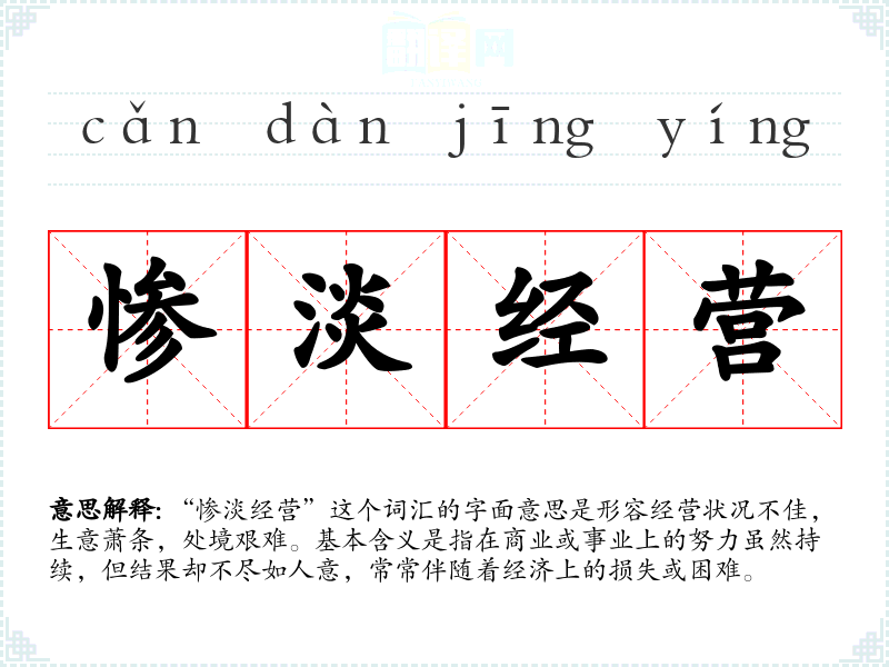 “惨淡经营”这个词汇源于汉语,其中“惨淡”原指颜色暗淡,后引申为形容情况不佳,“经营”则指商业上的运作和管理。这个词汇在近代汉语中逐渐固定下来,用来描述商业或事业上的困难状态。