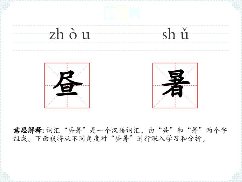 词汇“昼暑”是一个汉语词汇,由“昼”和“暑”两个字组成。下面我将从不同角度对“昼暑”进行深入学*和分析。