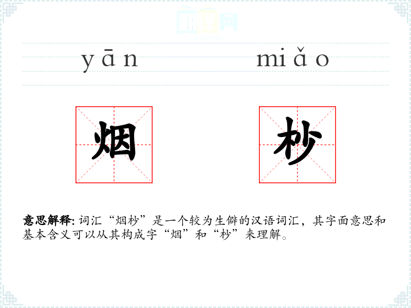 - “烟杪”一词在古代文献中较为少见,可能是由“烟”和“杪”两个字组合而成,用以形容特定的自然景象。