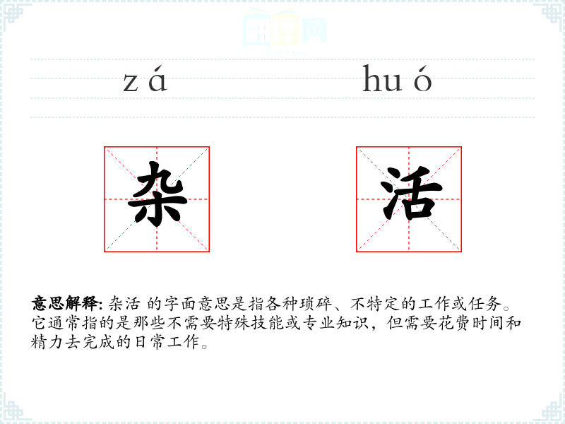 杂活 的字面意思是指各种琐碎、不特定的工作或任务。它通常指的是那些不需要特殊技能或专业知识,但需要花费时间和精力去完成的日常工作。
