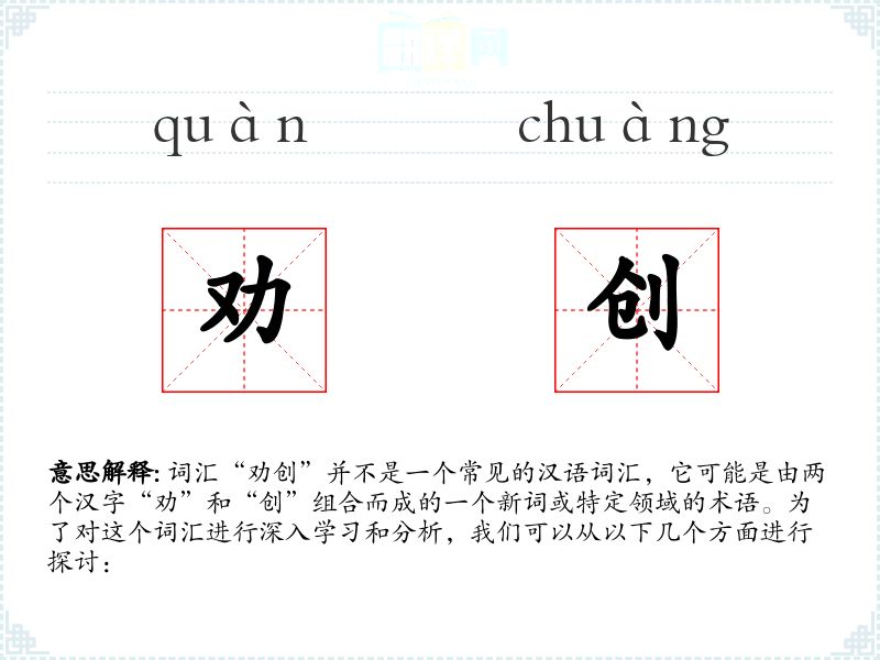 词汇“劝创”并不是一个常见的汉语词汇,它可能是由两个汉字“劝”和“创”组合而成的一个新词或特定领域的术语。为了对这个词汇进行深入学习和分析,我们可以从以下几个方面进行探讨: