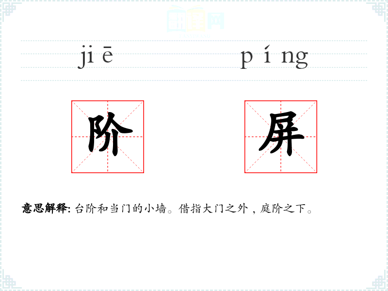 台阶和当门的小墙。借指大门之外﹐庭阶之下。