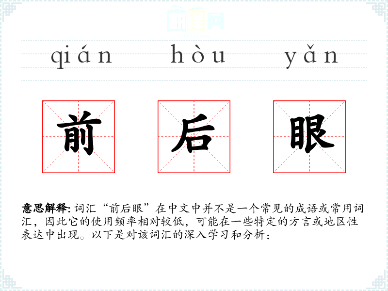 词汇“前后眼”在中文中并不是一个常见的成语或常用词汇,因此它的使用频率相对较低,可能在一些特定的方言或地区性表达中出现。以下是对该词汇的深入学习和分析: