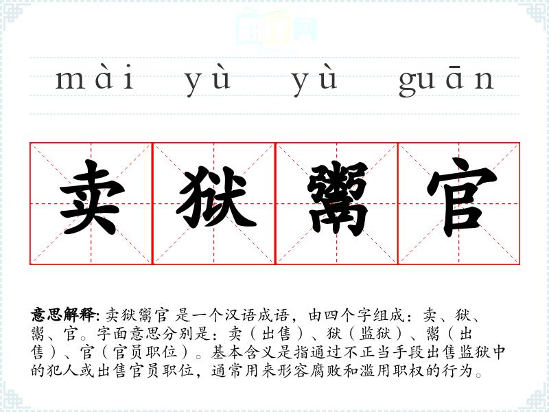 卖狱鬻官 是一个汉语成语,由四个字组成:卖、狱、鬻、官。字面意思分别是:卖(出售)、狱(监狱)、鬻(出售)、官(官员职位)。基本含义是指通过不正当手段出售监狱中的犯人或出售官员职位,通常用来形容腐败和滥用职权的行为。