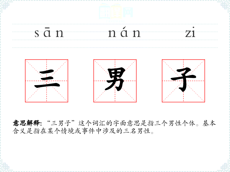 “三男子”这个词汇的词源较为直接,由数字“三”和名词“男子”组合而成。在汉语中,这种组合方式常见于描述具体数量的名词短语。
