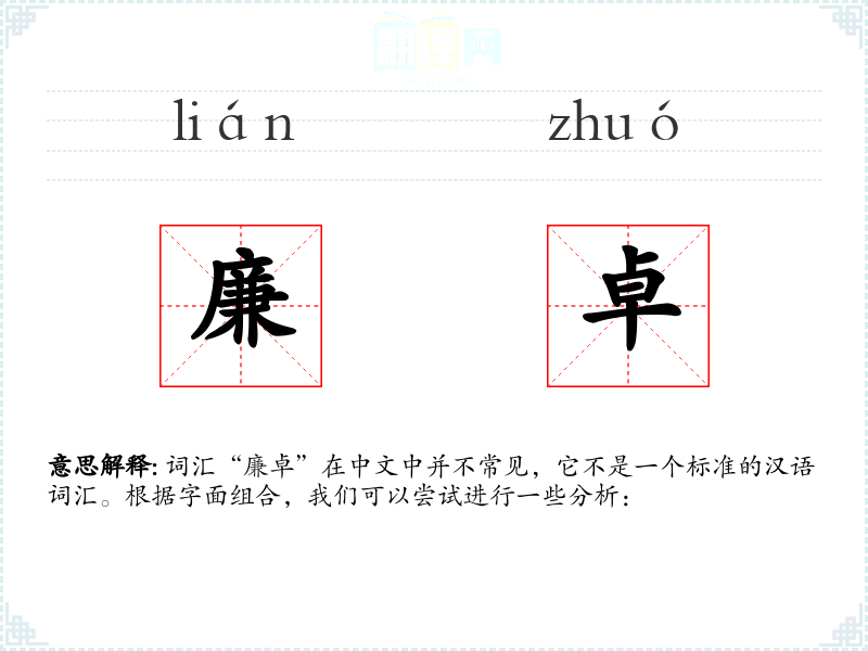 词汇“廉卓”在中文中并不常见,它不是一个标准的汉语词汇。根据字面组合,我们可以尝试进行一些分析: