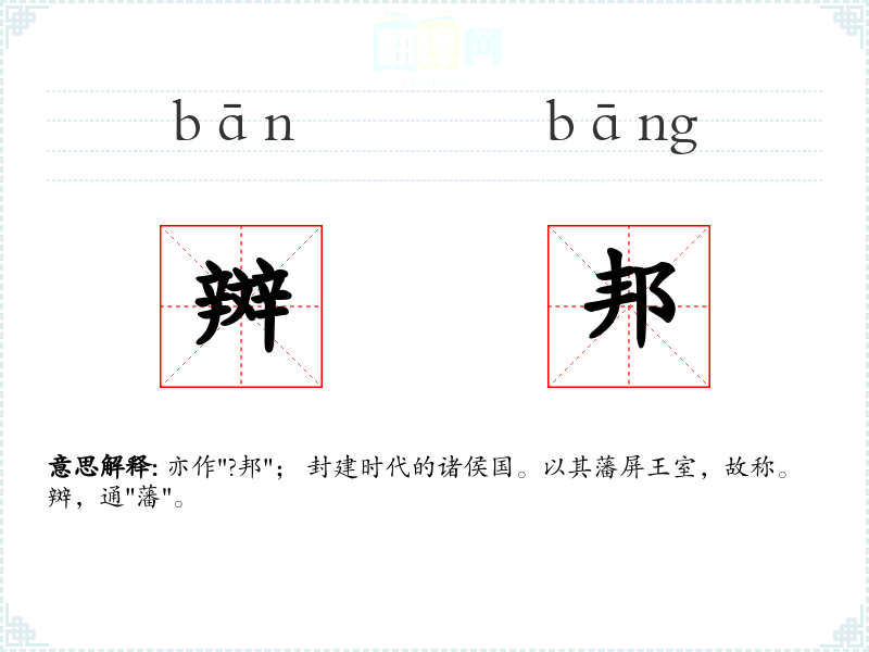 亦作"?邦"; 封建时代的诸侯国。以其藩屏王室,故称。辬,通"藩"。