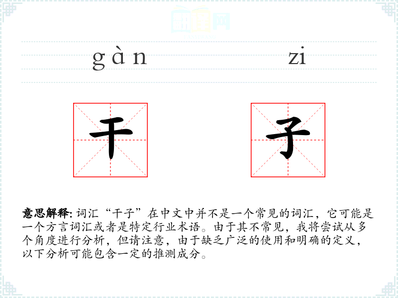词汇“干子”在中文中并不是一个常见的词汇,它可能是一个方言词汇或者是特定行业术语。由于其不常见,我将尝试从多个角度进行分析,但请注意,由于缺乏广泛的使用和明确的定义,以下分析可能包含一定的推测成分。