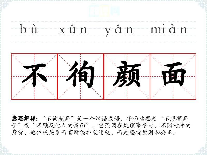 “不徇颜面”是一个汉语成语,字面意思是“不照顾面子”或“不顾及他人的情面”。它强调在处理事情时,不因对方的身份、地位或关系而有所偏袒或迁就,而是坚持原则和公正。