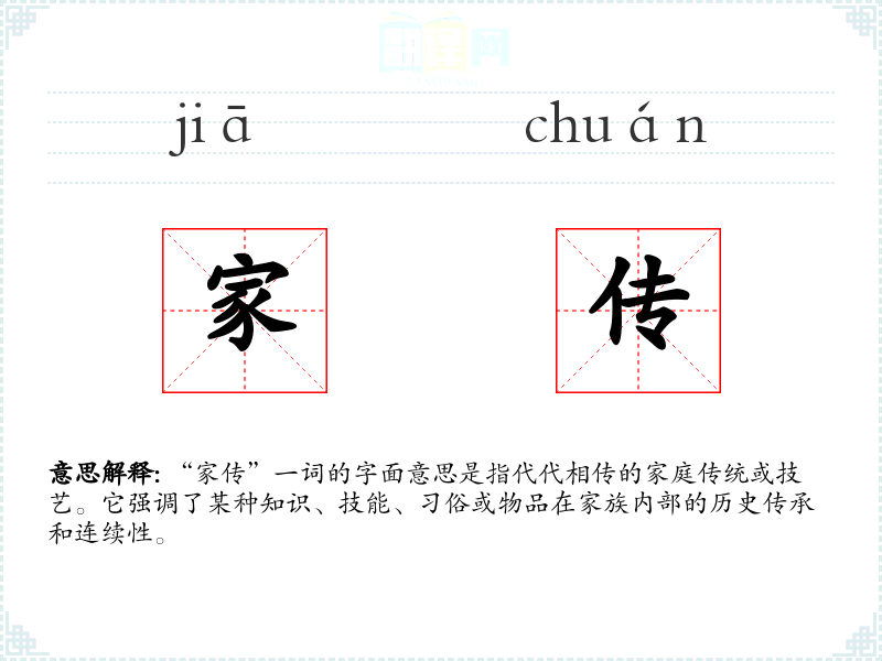 “家传”一词源于汉语,由“家”和“传”两个字组成。在古代汉语中,“传”已有传递、传承的含义,与“家”结合后,强调了这种传递的家族性质。随着时间的推移,这个词的含义和用法基本保持稳定。