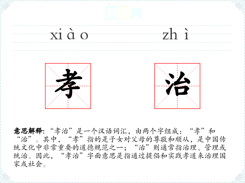 “孝治”是一个汉语词汇,由两个字组成:“孝”和“治”。其中,“孝”指的是子女对父母的尊敬和顺从,是**传统文化中非常重要的道德规范之一;“治”则通常指治理、管理或统治。因此,“孝治”字面意思是指通过提倡和实践孝道来治理国家或社会。