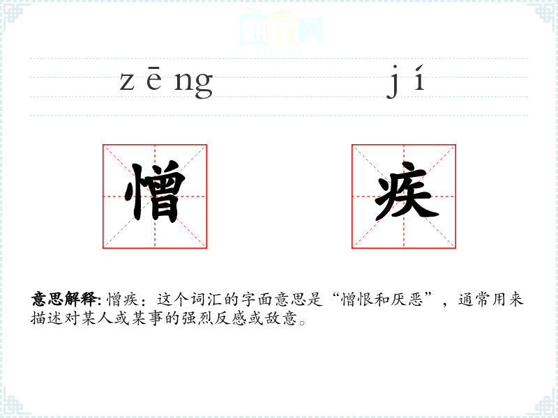 憎疾:这个词汇的字面意思是“憎恨和厌恶”,通常用来描述对某人或某事的强烈反感或敌意。