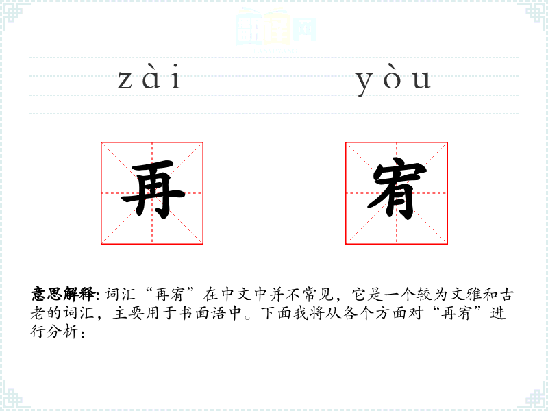 词汇“再宥”在中文中并不常见,它是一个较为文雅和古老的词汇,主要用于书面语中。下面我将从各个方面对“再宥”进行分析: