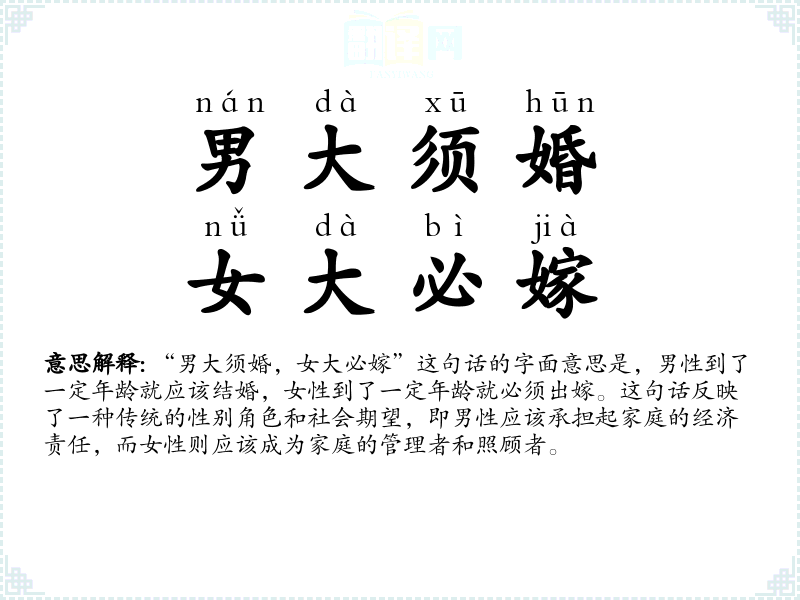 “男大须婚,女大必嫁”这句话的字面意思是,男性到了一定年龄就应该结婚,女性到了一定年龄就必须出嫁。这句话反映了一种传统的性别角色和社会期望,即男性应该承担起家庭的经济责任,而女性则应该成为家庭的管理者和照顾者。