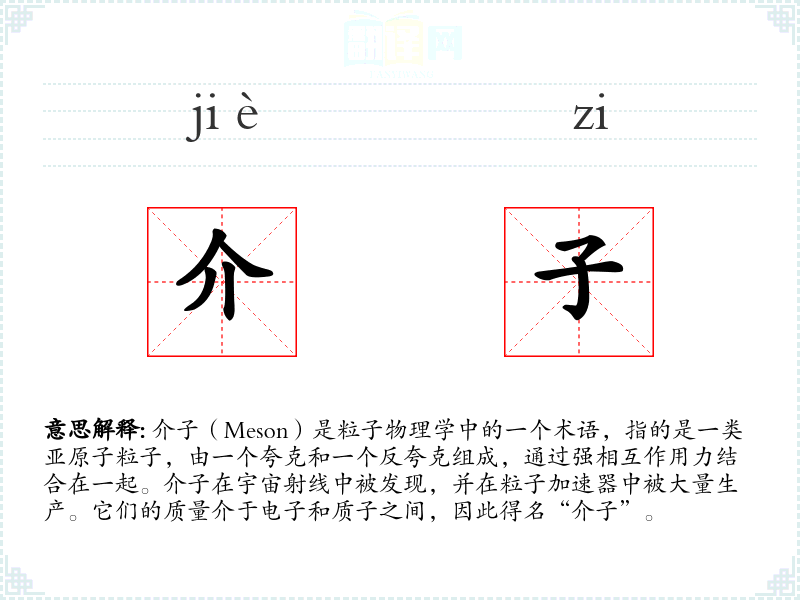 - 反义词:无明显反义词,因为介子是一个中性术语,没有明显的对立概念。