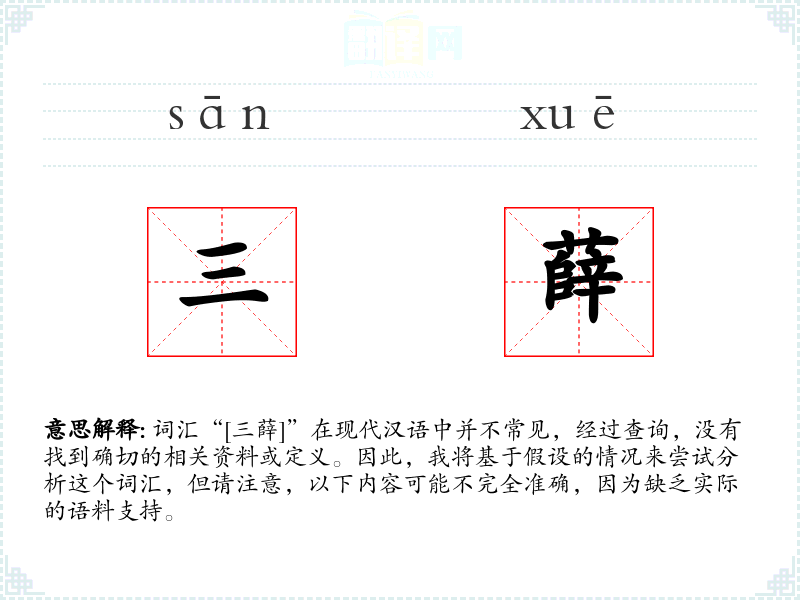 由于“[三薛]”不是一个已知的词汇,我们无法提供确切的基本定义。如果这是一个特定领域或方言中的词汇,可能需要具体的语境来解释其含义。