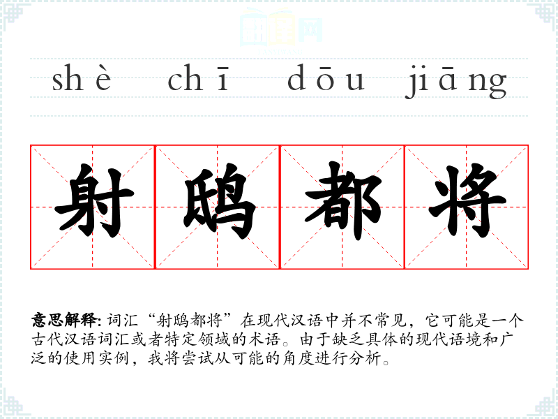 词汇“射鸱都将”在现代汉语中并不常见,它可能是一个古代汉语词汇或者特定领域的术语。由于缺乏具体的现代语境和广泛的使用实例,我将尝试从可能的角度进行分析。