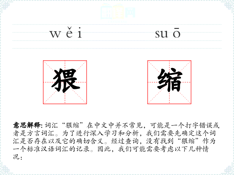 词汇“猥缩”在中文中并不常见,可能是一个打字错误或者是方言词汇。为了进行深入学习和分析,我们需要先确定这个词汇是否存在以及它的确切含义。经过查询,没有找到“猥缩”作为一个标准汉语词汇的记录。因此,我们可能需要考虑以下几种情况:
