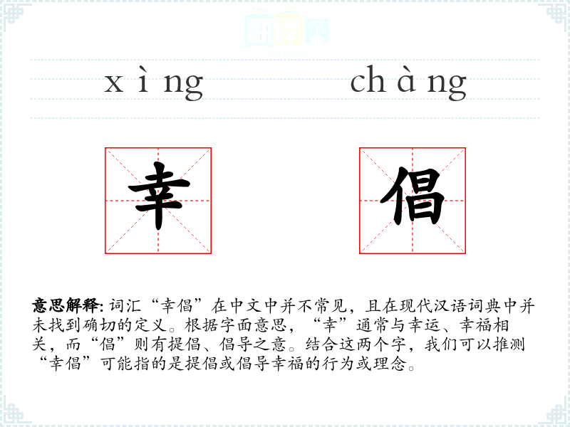 词汇“幸倡”在中文中并不常见,且在现代汉语词典中并未找到确切的定义。根据字面意思,“幸”通常与幸运、幸福相关,而“倡”则有提倡、倡导之意。结合这两个字,我们可以推测“幸倡”可能指的是提倡或倡导幸福的行为或理念。